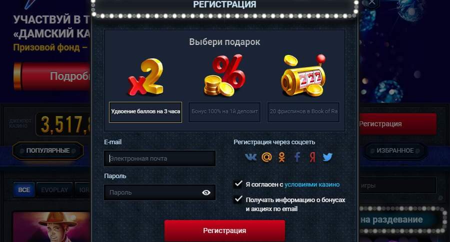 Для того, чтобы попробовать свои силы в онлайн игре на реальные деньги и получить быстрый вывод рублей, нужно пройти регистрацию в клубе Вулкан и пополнить счет. Процедура проста, нужно указать адрес электронной почты, пароль. Валюту выбирать не придется, так как она стандартная – рубли. Также клуб Вулкан предлагает быструю регистрацию, через социальные сети, которыми пользуется геймер (ВК, Фейсбук, Твиттер, МейлРу и другие).