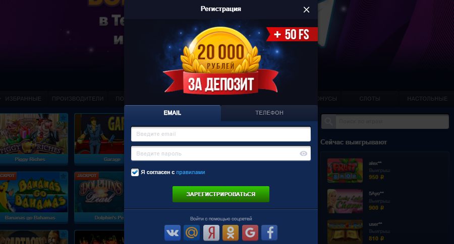 При выборе второго варианта игрок нажимает на кнопку «Регистрация», после чего открывается анкета, куда он вводит адрес действующей электронной почты, пароль, читает и соглашается с правилами казино. Завершением регистрационного процесса является нажатие на кнопку «Зарегистрироваться».